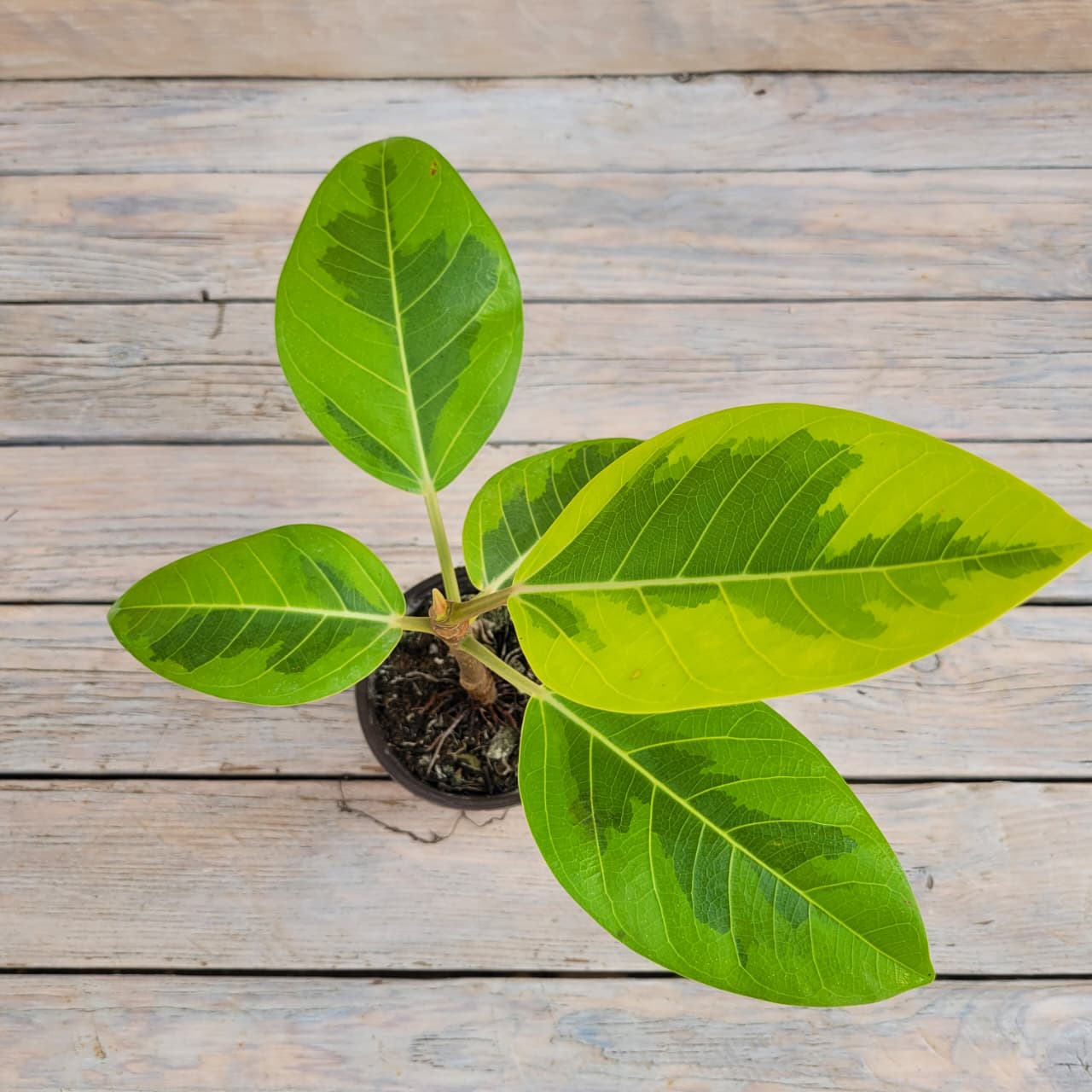 Это деревце с крепким стволом и пышной кроной из глянцевых листьев с золотистыми прожилками. Представьте себе, как солнечные лучи играют на его листьях, создавая волшебную атмосферу в вашем пространстве.
