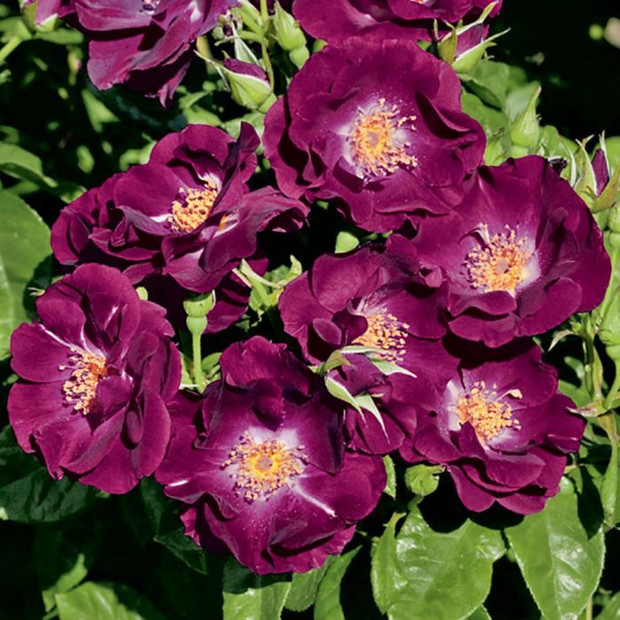 Найт Оул — это триумф селекции в категории «синих» роз. Её крупные, полумахровые цветы (8–12 лепестков) имеют бархатистую текстуру и окрашены в уникальный темный сливово-пурпурный цвет. В центре каждого цветка находится яркое белое пятно, на фоне которого светятся золотистые тычинки, словно звезды на ночном небе.